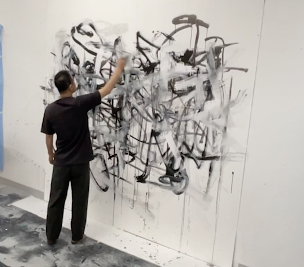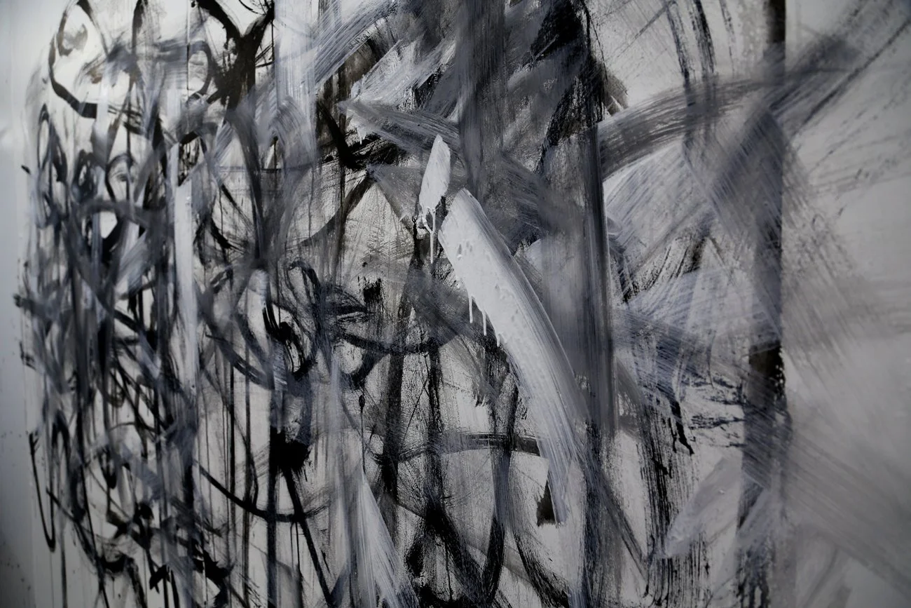 Black Ink and Acrylic on wood panel, 96 × 110 in, 2025